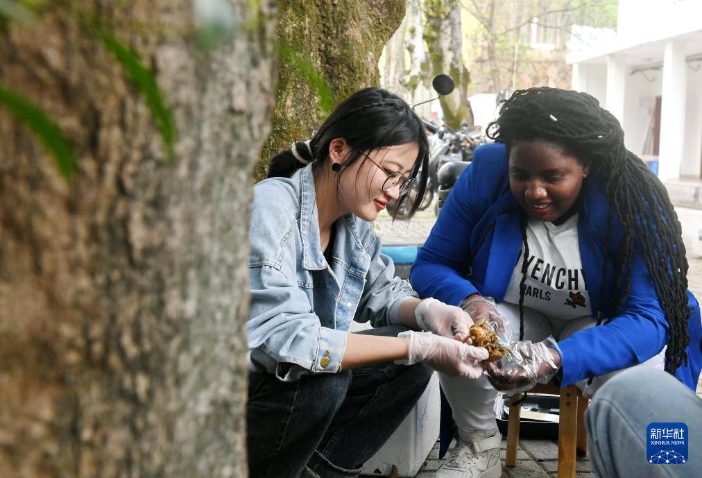 2024年3月28日,在位于福州的福建農(nóng)林大學,來自盧旺達的梅迪在國家菌草工程技術(shù)研究中心向中國學生嘉欣瑤了解“綠洲3號”菌草品種。新華社記者 林善傳 攝