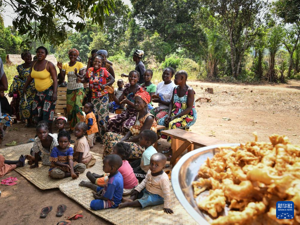 2024年2月5日,在中非共和國班吉的格巴村,村民們在等待新鮮炸蘑菇。新華社記者 韓旭 攝