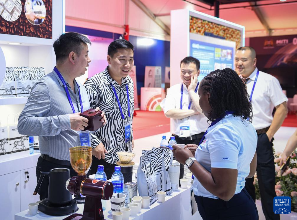 2024年5月9日,參展商在肯尼亞首都內(nèi)羅畢舉辦的中非經(jīng)貿(mào)博覽會走進非洲巡展上推銷咖啡產(chǎn)品。新華社記者 李亞輝 攝