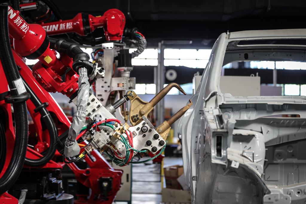 這是6月3日拍攝的點(diǎn)焊機(jī)器人。機(jī)器人被廣泛應(yīng)用于產(chǎn)業(yè)轉(zhuǎn)型升級(jí)的現(xiàn)實(shí)場(chǎng)景中,它們能夠勝任繁重、危險(xiǎn)或復(fù)雜的工作,提高生產(chǎn)效率和經(jīng)濟(jì)效益。新華社記者潘昱龍攝