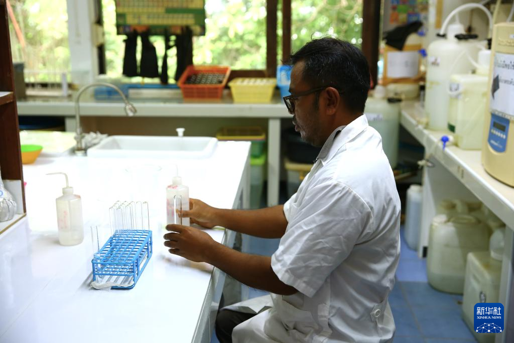 7月23日,在位于泰國普吉的中泰氣候與海洋生態(tài)系統(tǒng)聯(lián)合實驗室,工作人員進行水質檢測。新華社記者 孫瑋彤 攝