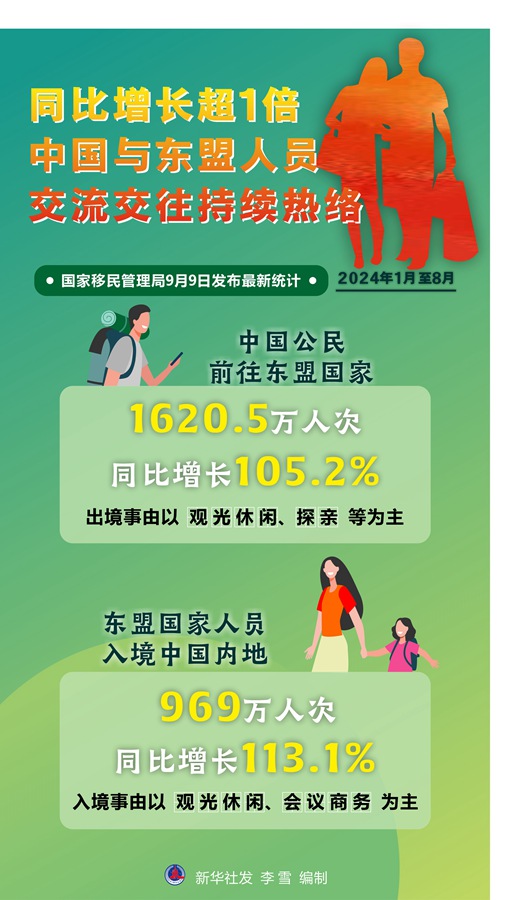 國家移民管理局9日發(fā)布最新統(tǒng)計,2024年1月至8月,中國公民前往東盟國家1620.5萬人次,同比增長105.2%,出境事由以觀光休閑、探親等為主;東盟國家人員入境中國內(nèi)地969萬人次,同比增長113.1%,入境事由以觀光休閑、會議商務(wù)為主。