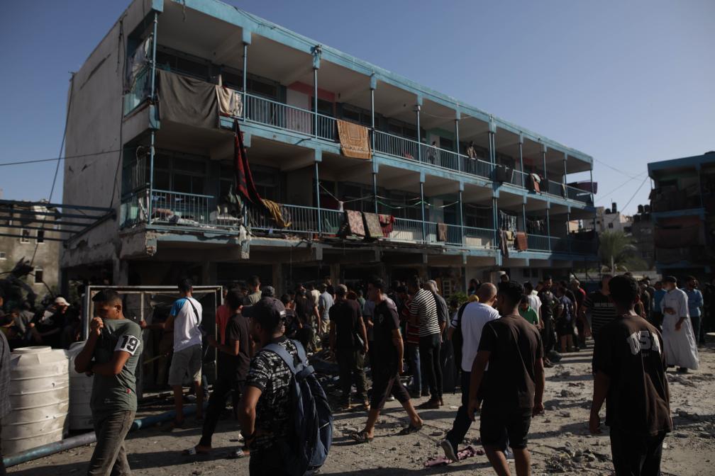 9月11日,在加沙地帶中部努賽賴特難民營(yíng),人們聚集在以軍轟炸后的學(xué)校廢墟附近。新華社發(fā)(馬爾萬·達(dá)烏德攝)