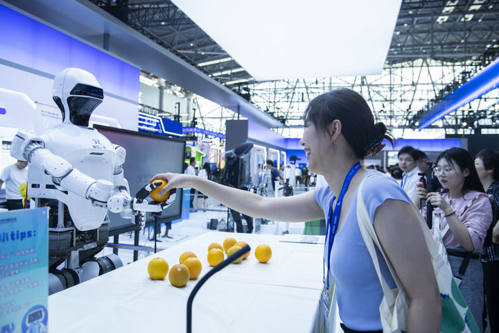 9月20日,在2024世界制造業(yè)大會(huì)展館內(nèi),人形機(jī)器人“啟江二號(hào)”抓取橙子遞給參觀者。新華社記者 黃博涵 攝