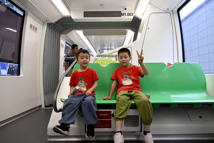 9月21日,在2024世界制造業(yè)大會(huì)上,小朋友參觀體驗(yàn)阿爾斯通跨座式單軌列車。新華社記者 黃博涵 攝