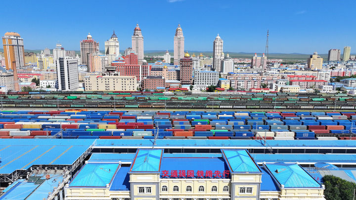 2024年8月20日,出境的中歐班列在中國鐵路哈爾濱局集團(tuán)有限公司內(nèi)蒙古滿洲里站內(nèi)整裝待發(fā)(無人機(jī)照片)。