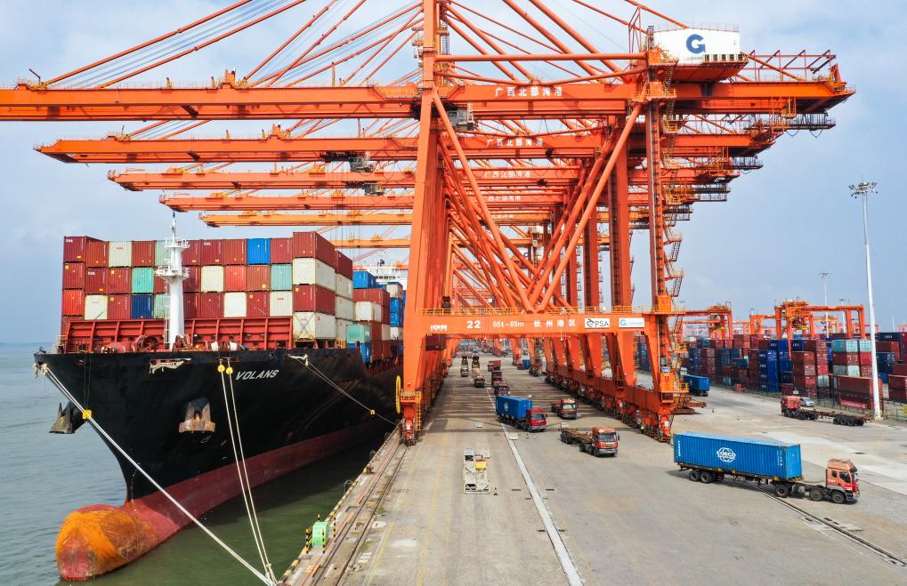 在廣西北部灣港欽州港區(qū)碼頭,吊車為貨輪卸載集裝箱(10月20日攝,無人機照片)。新華社記者李賀攝