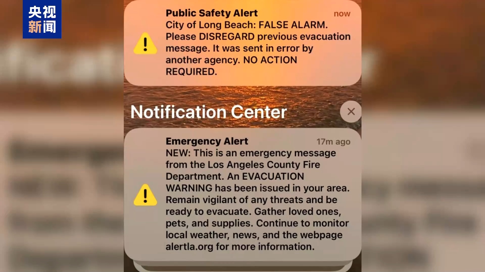 央視記者 劉驍騫:與此同時,根據(jù)我在一線的觀察,人為造成的災(zāi)害正在出現(xiàn)。首先,洛杉磯縣的警報發(fā)布系統(tǒng)嚴(yán)重失靈,造成撤離信息的混亂。一般情況下,如果你所在的區(qū)域處于撤離預(yù)警或者需要立刻撤離的范圍內(nèi),手機就會收到由洛杉磯縣發(fā)布的政府警報。第一次發(fā)生警報失靈的情況是10日3時左右,我的手機發(fā)出巨大的警報聲,短信內(nèi)容顯示“我居住的區(qū)域需要立刻撤離”,但是我打開窗,發(fā)現(xiàn)室外并沒有煙味,我立刻登錄了另外幾個災(zāi)難預(yù)警app,也沒有發(fā)現(xiàn)周遭有新的山火出現(xiàn)。幾乎在同一時間,很多生活在洛杉磯不同區(qū)域的網(wǎng)友都表示收到了這條警報。在10日的白天,類似的錯誤警報幾乎每隔幾小時就出現(xiàn)一次,普通居民也從一開始收到警報時的緊張,變成麻木,有的人為了避免過于焦慮,甚至在手機設(shè)置中關(guān)掉了政府警報通知。