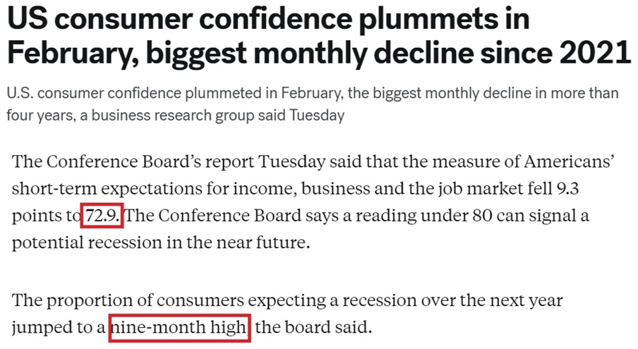 美國(guó)智庫(kù)“世界大型企業(yè)研究會(huì)”當(dāng)?shù)貢r(shí)間25日發(fā)布的最新調(diào)查報(bào)告顯示,美國(guó)2月消費(fèi)者信心指數(shù)(CCI)為98.3,創(chuàng)下2021年8月以來最大單月降幅。