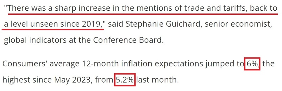在美國(guó)CCI以三年半以來的最大速度惡化的同時(shí),美國(guó)消費(fèi)者對(duì)未來一年的通脹預(yù)期也從5.2%大幅升高至6%,達(dá)到2023年5月以來的最高水平。這進(jìn)一步顯示,美國(guó)人對(duì)特朗普政府政策可能對(duì)經(jīng)濟(jì)造成的負(fù)面影響越來越擔(dān)憂。