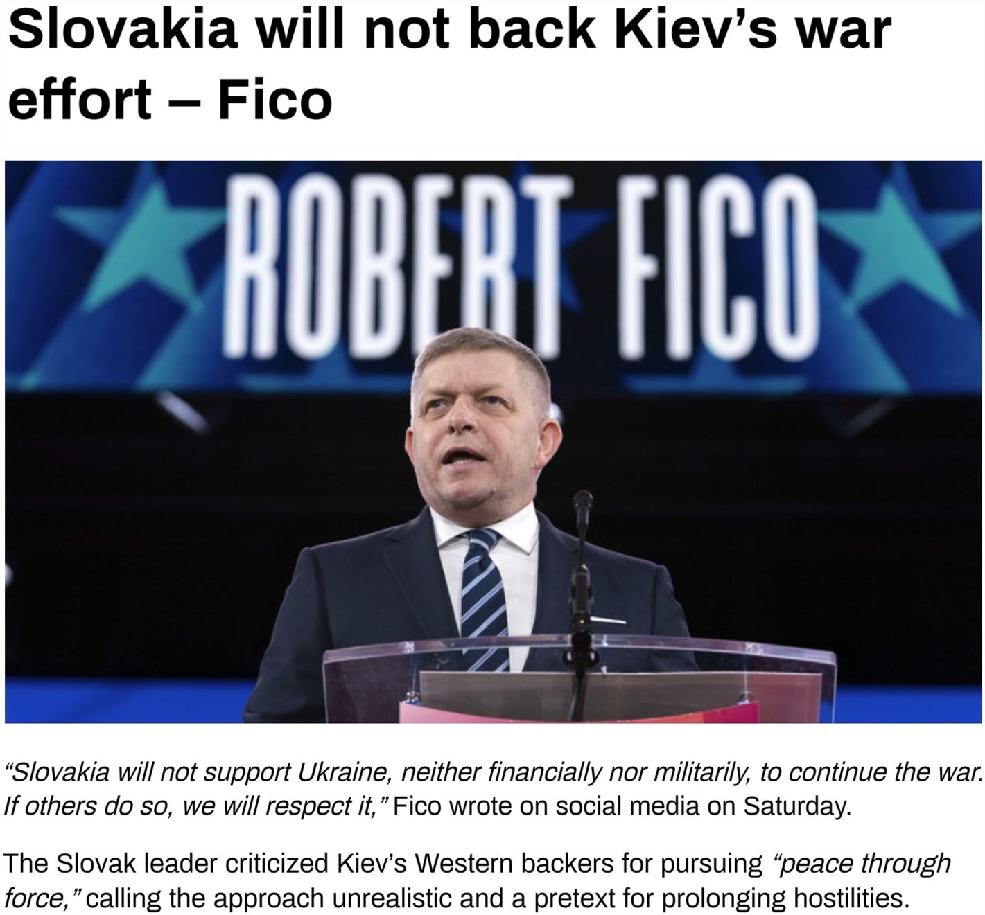 斯洛伐克總理菲佐則在社交媒體上發(fā)文,重申拒絕向烏克蘭提供軍事和財政支持的立場。他還批評稱,“用實力實現(xiàn)和平”的戰(zhàn)略不切實際,只是“繼續(xù)沖突”的借口。