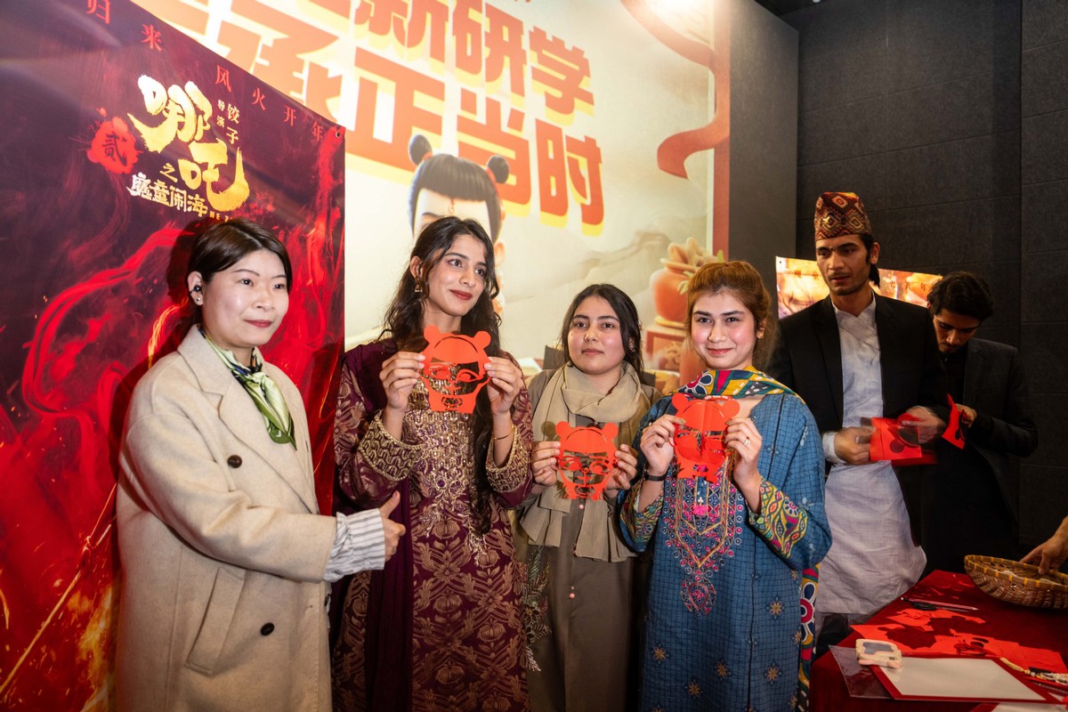 2月25日,在長沙摩天輪國際影城,留學(xué)生們在展示“哪吒”剪紙作品。(圖片來源:新華社)