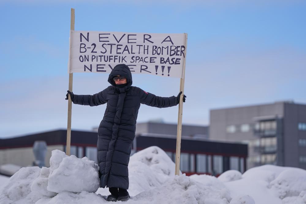 3月28日,在丹麥自治領(lǐng)地格陵蘭島首府努克,一名女子舉著抗議標(biāo)語(yǔ)。新華社記者彭子洋攝