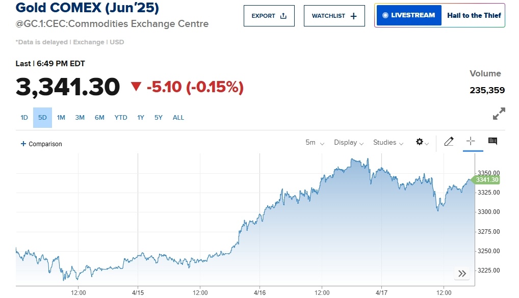 近期受美關稅政策影響,市場恐慌情緒蔓延,投資者投資策略偏向避險,進而拉升國際金價的走高。美東時間4月18日,美國紐約商品交易所6月黃金期貨價格收于每盎司3341.30美元,較前一日小幅下跌,但仍處于高位。