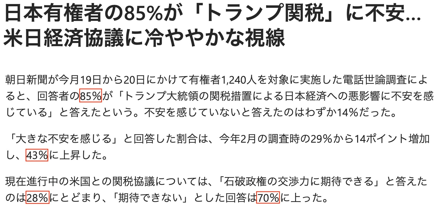 此外,多達(dá)70%的受訪者對(duì)日本政府與美國(guó)政府就關(guān)稅問(wèn)題進(jìn)行的交涉不抱期待。