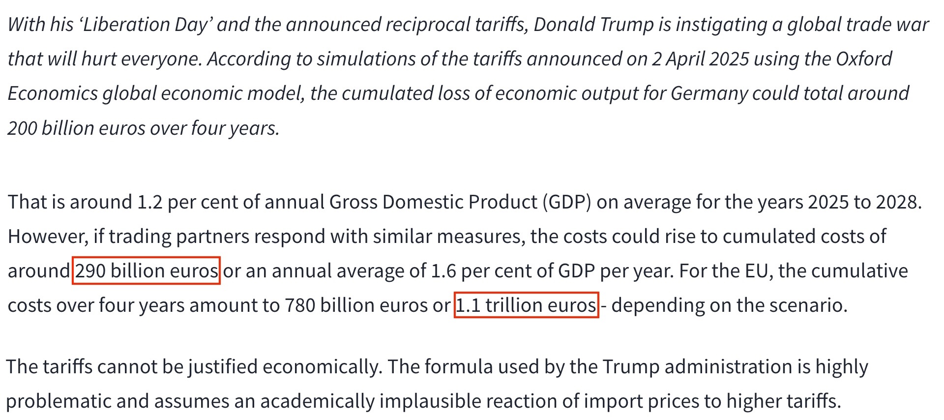 德國(guó)經(jīng)濟(jì)研究所日前發(fā)布的研究報(bào)告顯示,未來(lái)四年內(nèi),美國(guó)“對(duì)等關(guān)稅”措施可能令歐盟損失1.1萬(wàn)億歐元,僅德國(guó)就將損失2900億歐元。