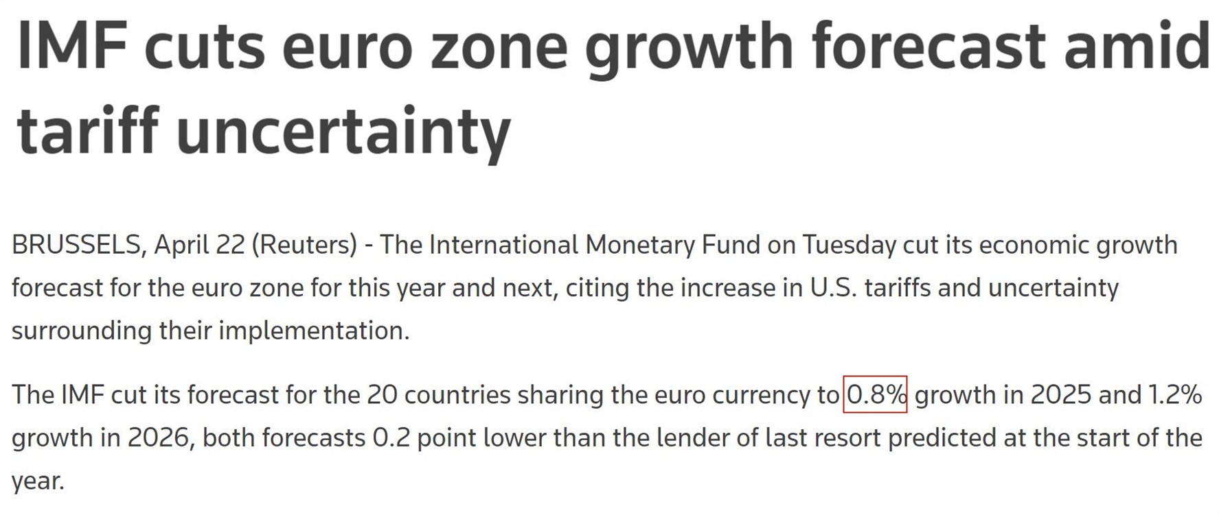 根據(jù)國(guó)際貨幣基金組織22日發(fā)布的最新一期《世界經(jīng)濟(jì)展望報(bào)告》,受美國(guó)關(guān)稅措施沖擊和政策不確定性的影響,今年歐元區(qū)經(jīng)濟(jì)增長(zhǎng)率預(yù)計(jì)將比之前下調(diào)0.2個(gè)百分點(diǎn)至0.8%。