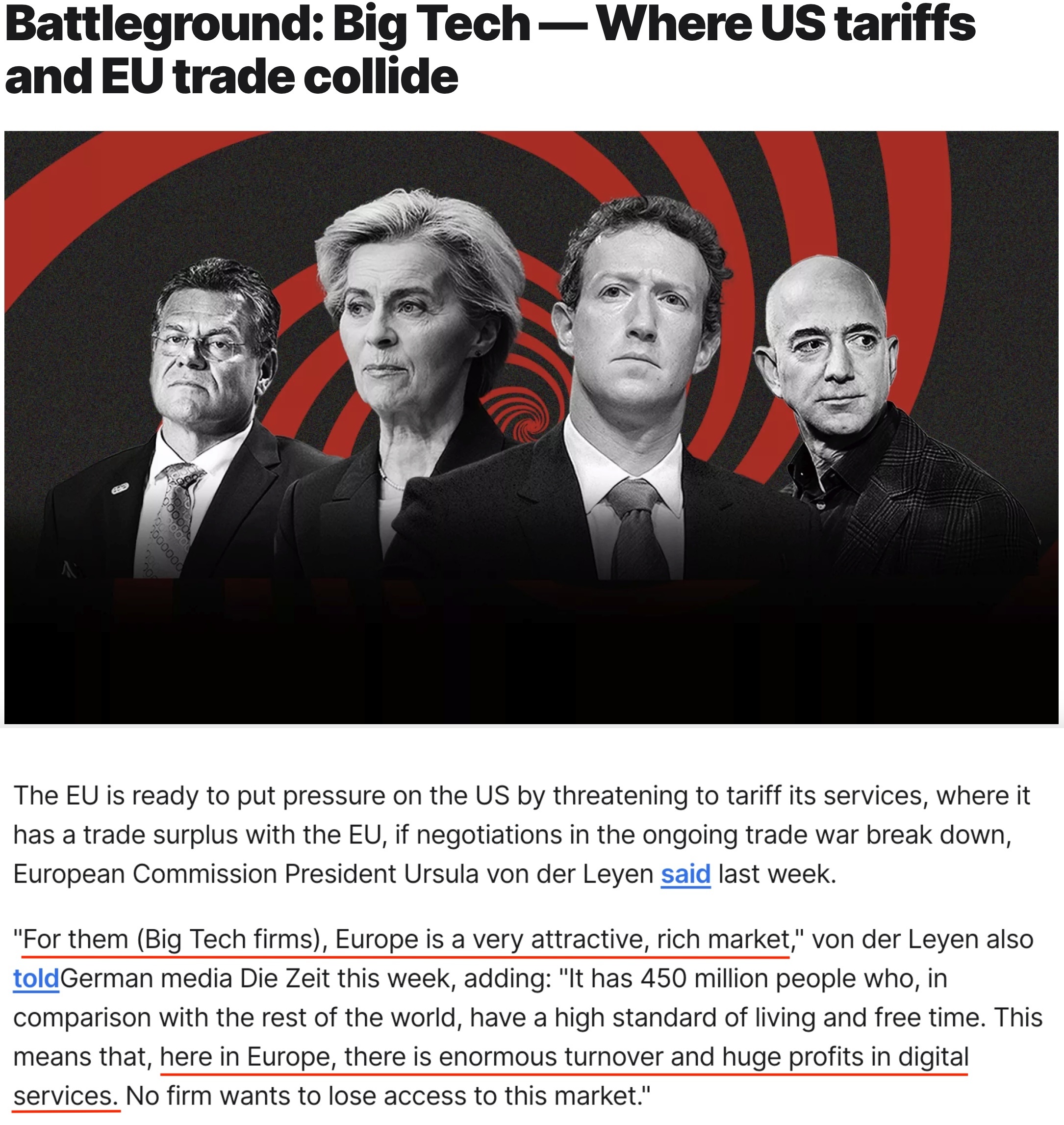 馮德萊恩強(qiáng)調(diào),歐盟有4.5億人口,民眾生活水平高,這意味著在歐盟,數(shù)字服務(wù)有著巨大的營(yíng)業(yè)額和利潤(rùn),沒(méi)有誰(shuí)愿意失去進(jìn)入這個(gè)市場(chǎng)的機(jī)會(huì)。