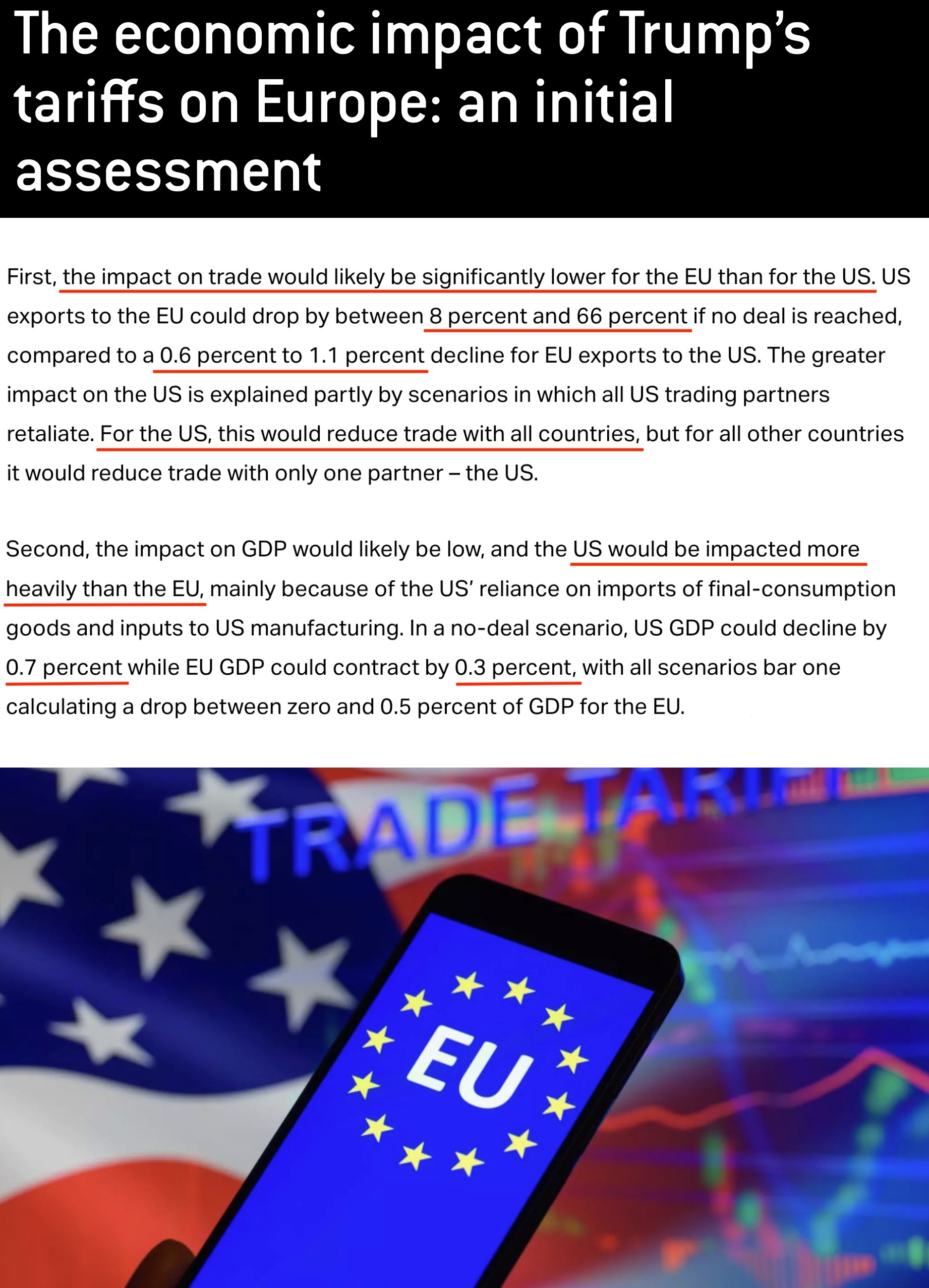 至于關(guān)稅對(duì)國(guó)內(nèi)生產(chǎn)總值(GDP)的影響,美國(guó)也將比歐盟更嚴(yán)重。如果不能與歐盟達(dá)成關(guān)稅協(xié)議,美國(guó)的GDP可能下降0.7%,而歐盟的GDP則可能僅下降0.3%。