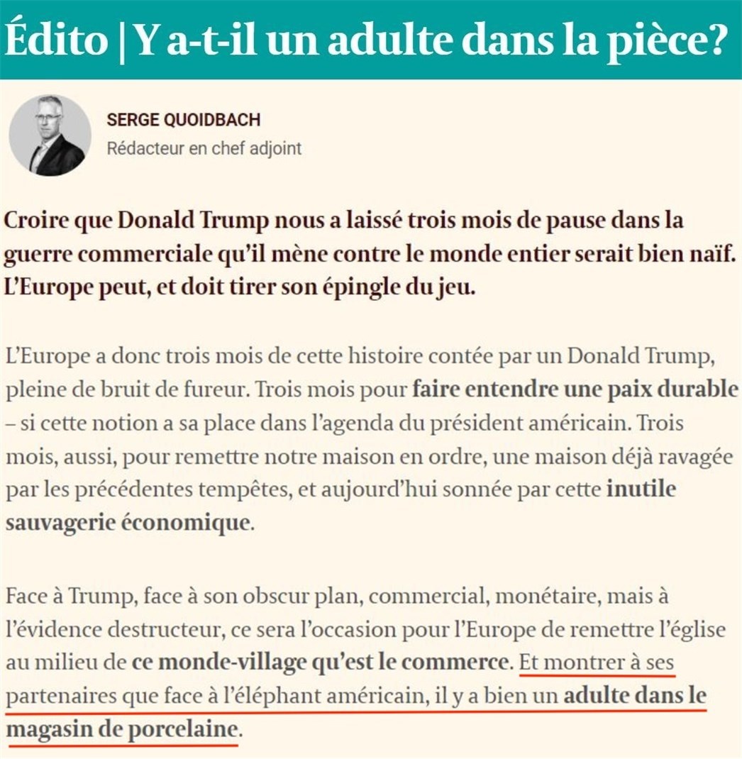 文章強(qiáng)調(diào),歐洲迫切需要推動(dòng)重建貿(mào)易秩序,抓住機(jī)遇扭轉(zhuǎn)局勢(shì),從而向合作伙伴證明,在美國(guó)這頭“大象”肆意妄為之際,瓷器店里仍有“成年人”坐鎮(zhèn)。