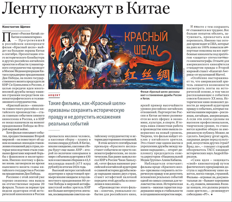 當(dāng)?shù)貢r(shí)間5月7日,俄羅斯政府機(jī)關(guān)報(bào)《俄羅斯報(bào)》刊發(fā)題為《中俄合拍電影〈紅絲綢〉將在中國(guó)上映》的評(píng)論文章。文章指出,在俄羅斯紀(jì)念蘇聯(lián)偉大衛(wèi)國(guó)戰(zhàn)爭(zhēng)勝利80周年前夕,在中國(guó)國(guó)家主席習(xí)近平應(yīng)邀對(duì)俄羅斯進(jìn)行國(guó)事訪問(wèn)之際,中國(guó)中央廣播電視總臺(tái)將在莫斯科舉辦中俄合拍電影《紅絲綢》及其他中俄人文合作項(xiàng)目的推介活動(dòng),通過(guò)影視交流合作傳遞中俄世代友好。文章援引專家觀點(diǎn)強(qiáng)調(diào),電影《紅絲綢》肩負(fù)著守護(hù)歷史真相的使命,防止人類至暗時(shí)刻的歷史被篡改。