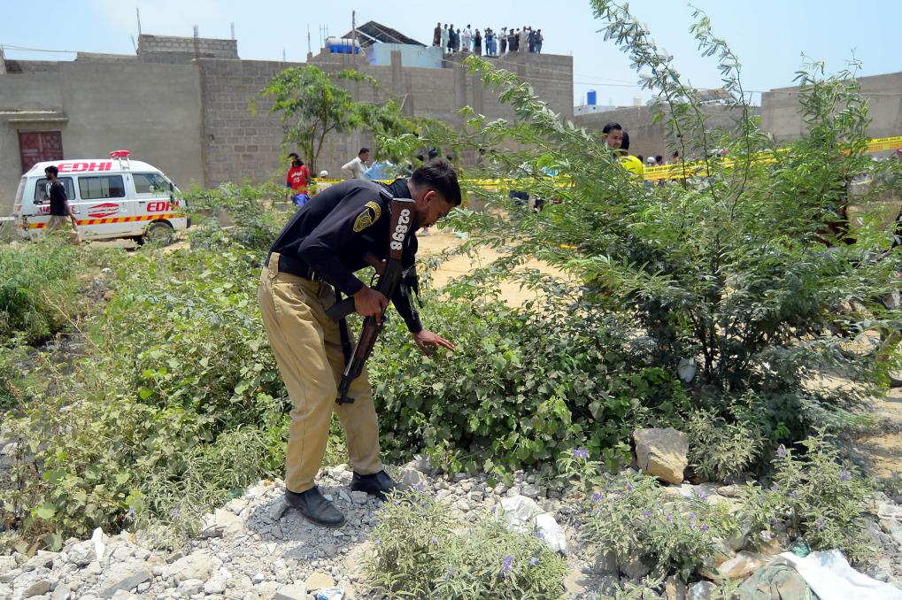 2025年5月8日,在巴基斯坦卡拉奇,安全人員檢查印度無人機(jī)襲擊現(xiàn)場(chǎng)附近區(qū)域。新華社發(fā)