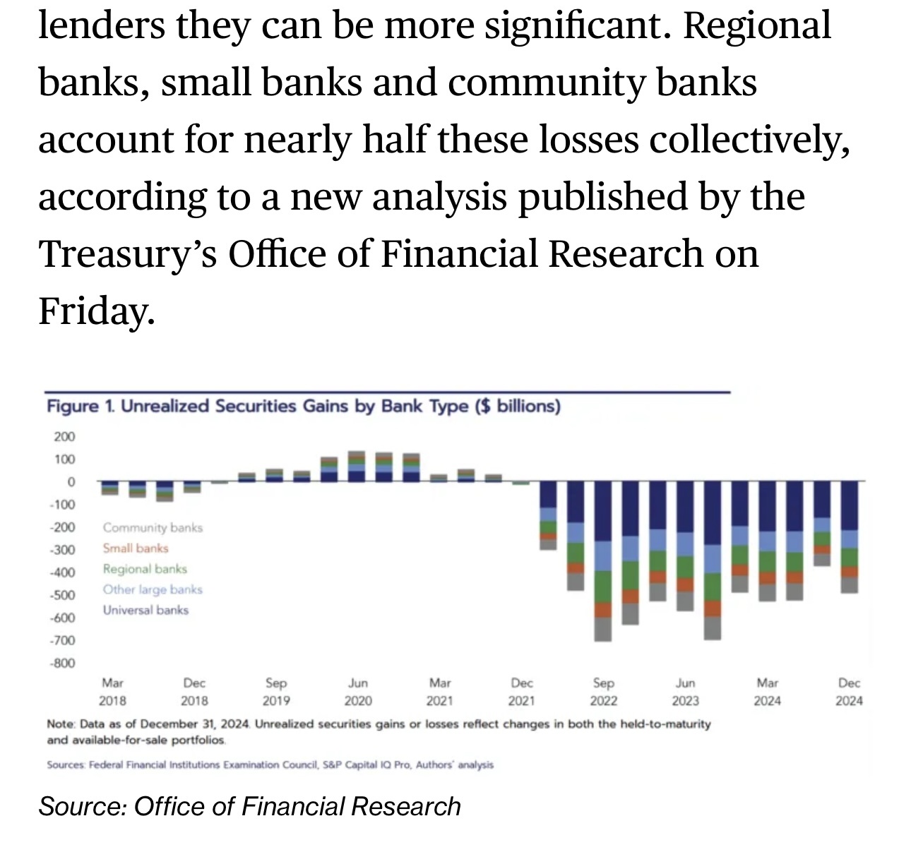 根據(jù)美國(guó)聯(lián)邦存款保險(xiǎn)公司的最新季度數(shù)據(jù),2024年第四季度,美國(guó)銀行債券持有的“未實(shí)現(xiàn)損失”總額進(jìn)一步擴(kuò)大,達(dá)到4820億美元,自9月底以來增加了1180億美元。而根據(jù)美國(guó)財(cái)政部金融研究辦公室此前發(fā)布的一份報(bào)告,地區(qū)性銀行、小型銀行和社區(qū)銀行共同承擔(dān)了這些損失的近一半。