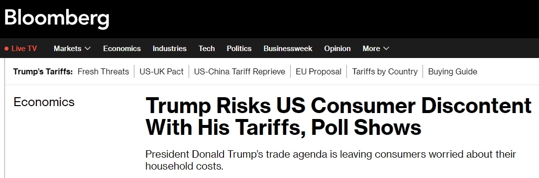彭博社近日民調(diào)顯示,56%的受訪美國人認(rèn)為,特朗普對其他國家征收的關(guān)稅對他們的家庭財務(wù)狀況產(chǎn)生了不良影響。即使特朗普政府一直在鼓吹加關(guān)稅能讓產(chǎn)業(yè)回流美國并增加財政收入,約52%的受訪者還是表示,美政府承諾的好處不值得他們?yōu)榇烁冻龅慕?jīng)濟代價。