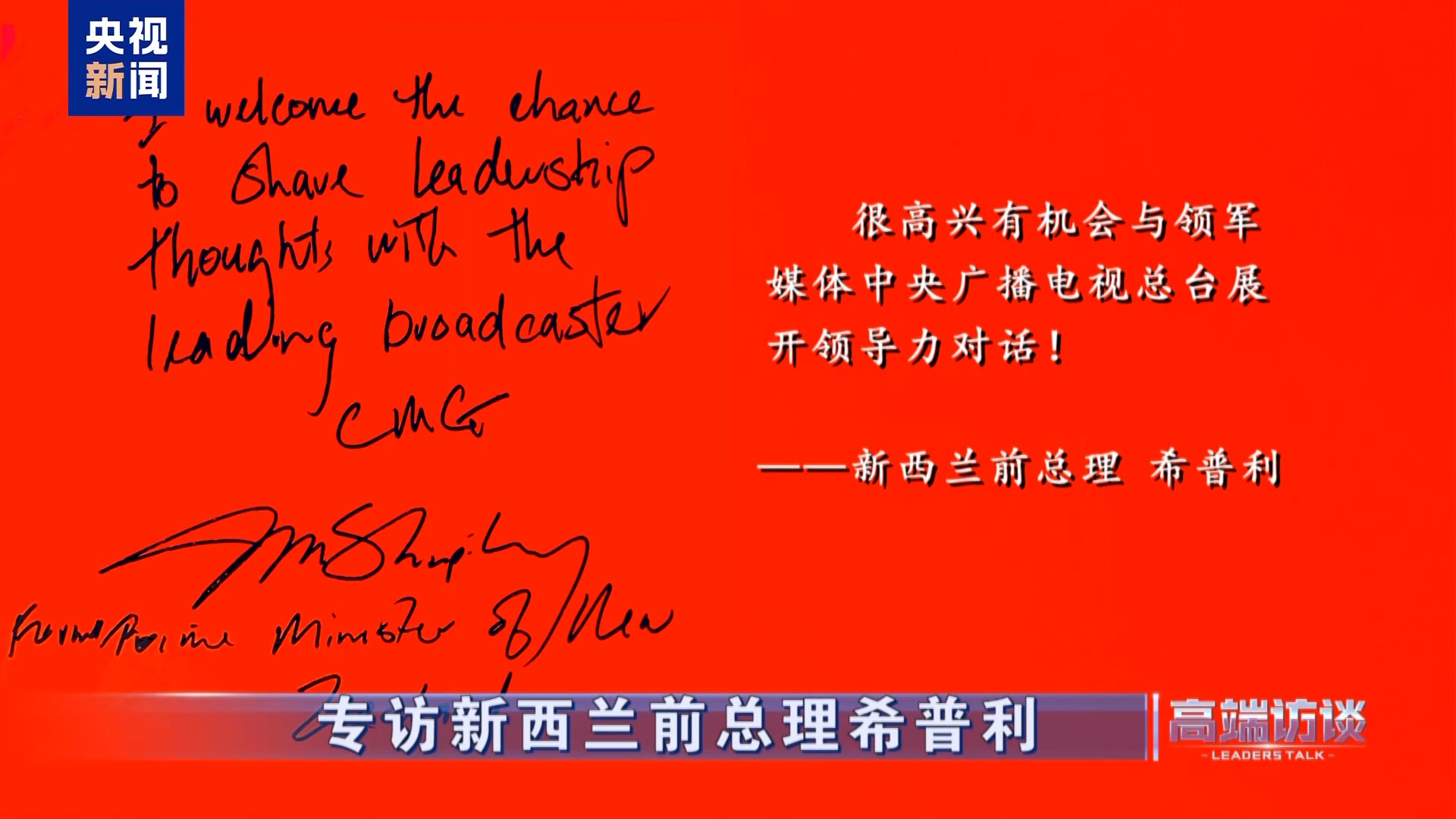 新西蘭前總理希普利在接受總臺(tái)專訪后題詞