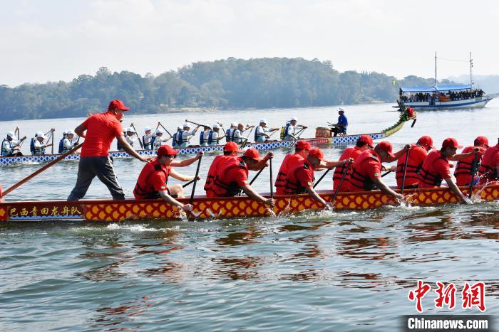 當地時間5月31日,巴西瑞安商會和巴西青田同鄉(xiāng)總會在巴西圣保羅聯合舉辦“慶端午,龍舟競渡”活動,吸引近500名僑胞和巴西友人參加。圖為巴西瑞安龍舟俱樂部和巴西青田龍舟隊擊鼓競渡。中新社記者 林春茵 攝