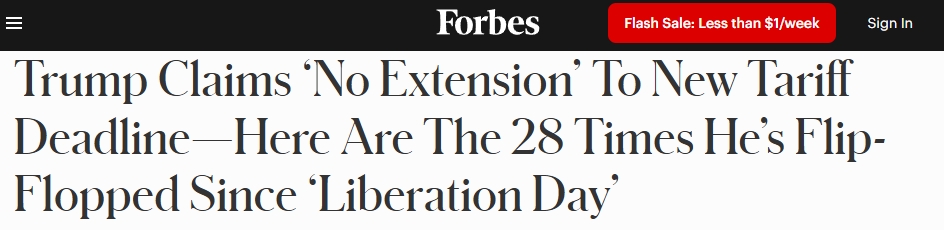 對(duì)于此次關(guān)稅調(diào)整,《福布斯》雜志網(wǎng)站7日?qǐng)?bào)道指出,從今年2月7日首次公開提及對(duì)他國進(jìn)口商品征收全面關(guān)稅,到強(qiáng)調(diào)“2025年8月1日這一日期不會(huì)有任何延長(zhǎng)”的這五個(gè)月里,特朗普政府在關(guān)稅問題上的態(tài)度“翻轉(zhuǎn)”了大約28次。