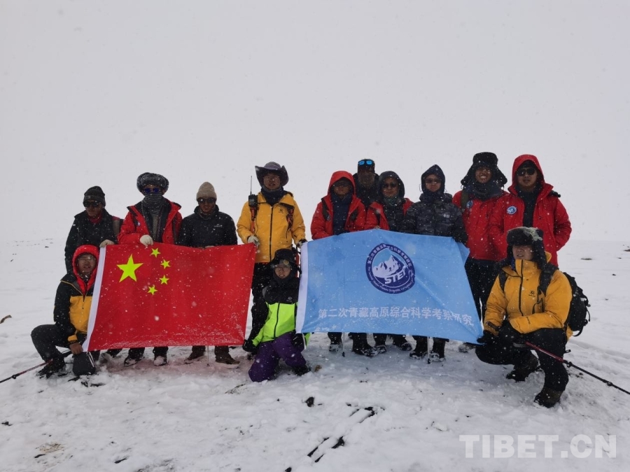 圖為中國科學(xué)院古脊椎動物與古人類研究所和西雙版納熱帶植物園科考人員在希夏邦馬峰海拔6000米化石地點的暴雪中 受訪者供圖