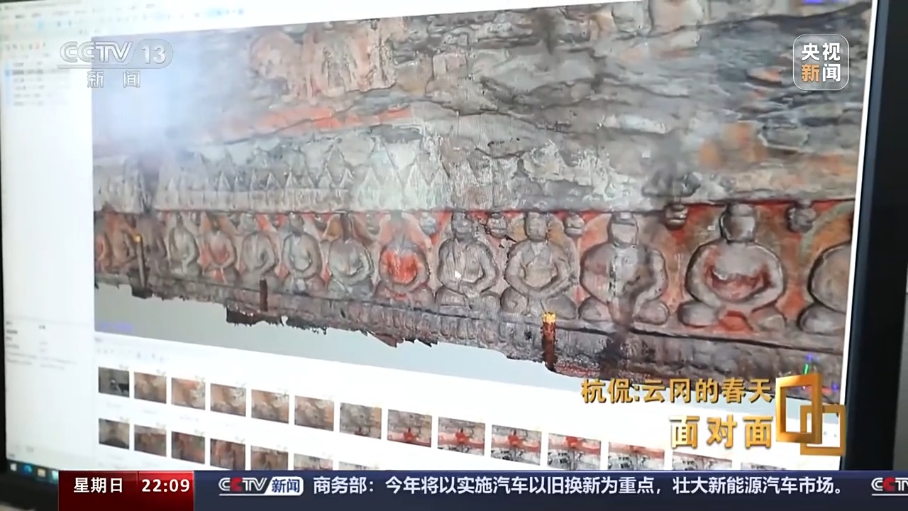 杭侃:因?yàn)槎鼗推鸩皆?,到現(xiàn)在都是我們學(xué)習(xí)的榜樣。但是敦煌它正是因?yàn)槠鸩皆?,可能我們現(xiàn)在技術(shù)迭代比較快。所以從技術(shù)迭代的角度來(lái)說(shuō)我們并不落后。我們現(xiàn)在的精度已經(jīng)到了0.03毫米了,但是那樣需要的算力是非常大的。我們這有一個(gè)超算中心,超算中心是什么概念?就是你看到的一個(gè)洞窟的運(yùn)算能力,要和一個(gè)中等城市的,我們叫智慧城市,那個(gè)量是一樣的。云岡它是一個(gè)皇家工程,所以那個(gè)像都特別大,敦煌它很多洞窟比較小,另外敦煌它的壁畫非常精彩,但是壁畫是二維的,所以相對(duì)掃描起來(lái)相對(duì)來(lái)說(shuō)容易,但是我們這個(gè)地方它一個(gè)是大,第二個(gè)就是雕刻的手法多。所以像你看到的第六窟,我們到現(xiàn)在都沒(méi)有拿得出來(lái),大家都能認(rèn)可的采集方案。