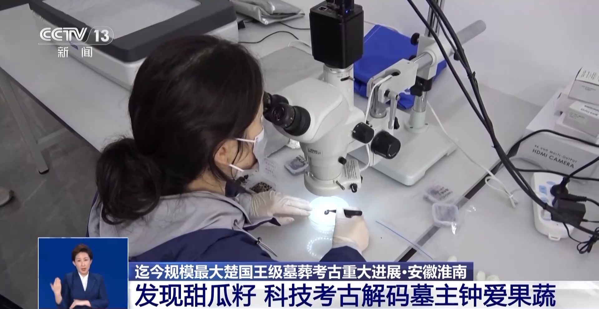 武王墩考古發(fā)掘項目文物保護負責(zé)人 張治國:發(fā)現(xiàn)大部分的這個里面都是一些樹葉,然后還有果核,可能還有一些草編的痕跡,目前初步鑒定出來的有甜瓜籽,然后還有一些梅核。