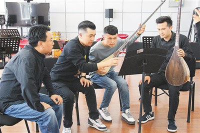新疆藝術(shù)學(xué)院師生為中國交響樂團(tuán)作曲家楊帆(左一)展示彈撥爾樂器。