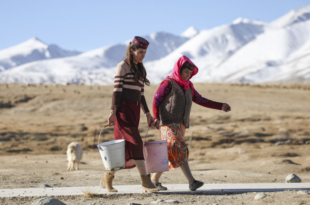 在新疆塔什庫爾干塔吉克自治縣瓦恰鄉(xiāng)夏布孜喀拉村,艾爾開牙·多力開(左)幫母親拎水(2024年3月23日攝)。