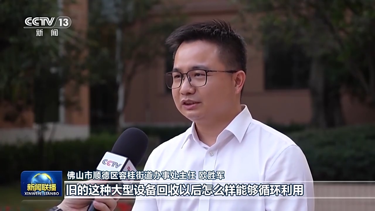 佛山市順德區(qū)容桂街道辦事處主任 歐勝軍:舊的這種大型設(shè)備回收以后怎么樣能夠循環(huán)利用,下一步我們也是由國(guó)資公司來跟我們本土的家電回收龍頭企業(yè)來進(jìn)行開發(fā),我們跟企業(yè)正在對(duì)接。