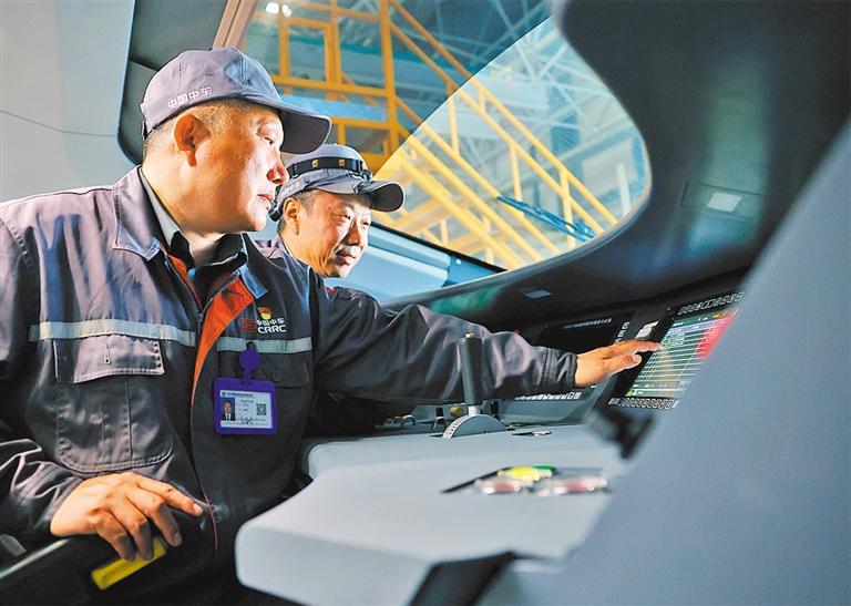 ?5月28日,中車長客首席操作師羅昭強(qiáng)(前一)在對新一批復(fù)興號智能動車組進(jìn)行出廠前的質(zhì)量檢查。