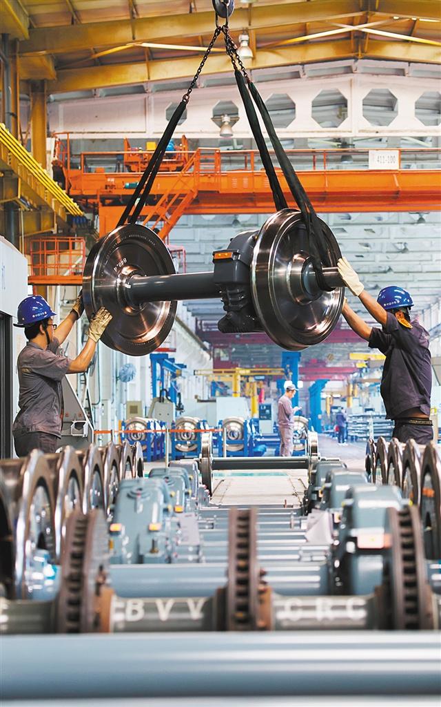 ▼5月28日,中車長客轉(zhuǎn)向架事業(yè)部總成產(chǎn)線組,員工在進(jìn)行城軌輪對壓裝作業(yè)。
