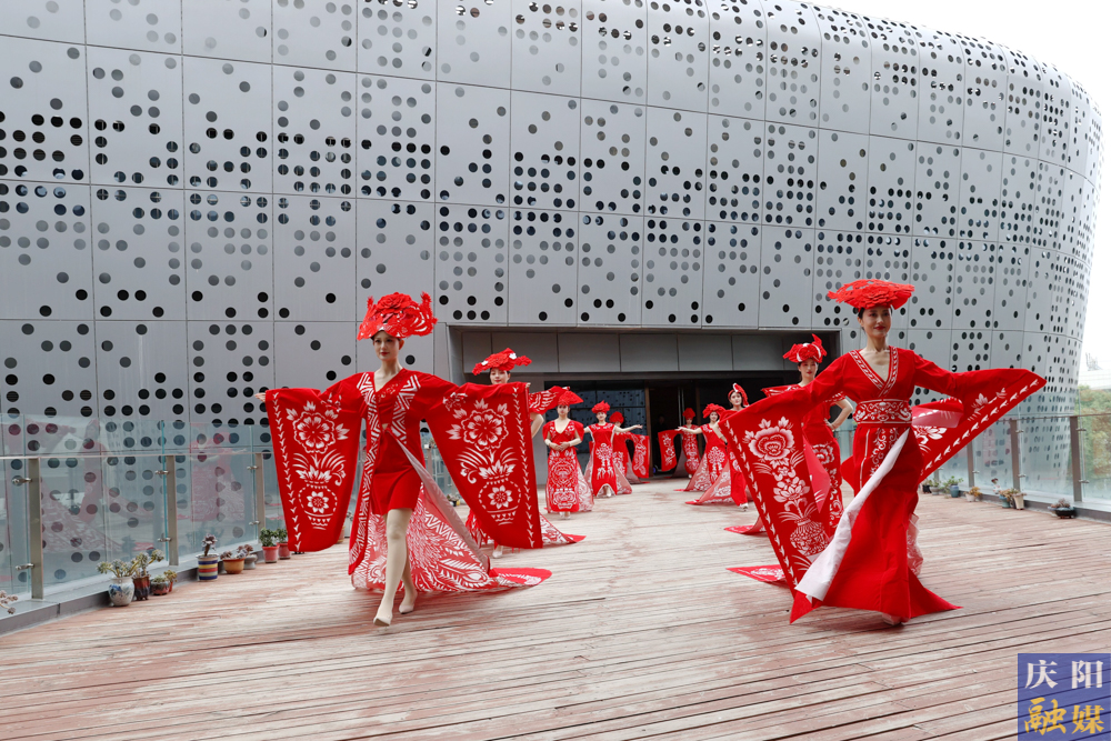 主播們身著刻鏤龍紋、鳳紋、抓髻娃娃、生命樹(shù)、魚(yú)鉆蓮、牡丹等剪紙紋樣,大V領(lǐng)、魚(yú)尾裙、聳肩收腰的“剪云裳”剪紙服裝,行走在傳媒大廈、西峰區(qū)彩虹橋、慶陽(yáng)市城市海綿運(yùn)動(dòng)綠地等處,全方位、多角度地展示了剪紙服裝的特色與魅力。