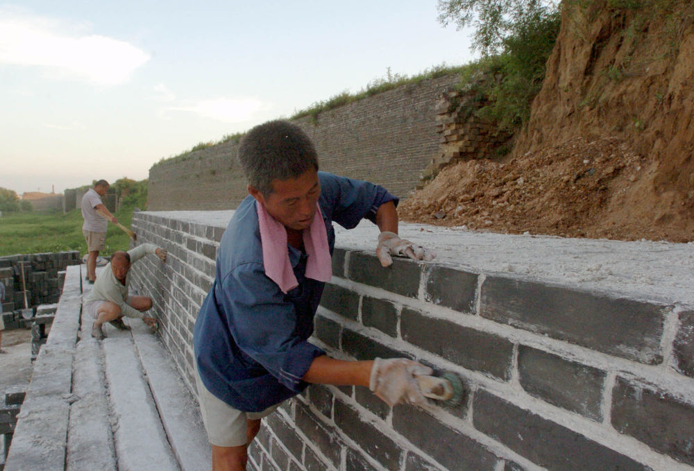 古建工人在修復山海關古城城墻(2005年8月29日攝)。新華社發(fā)
