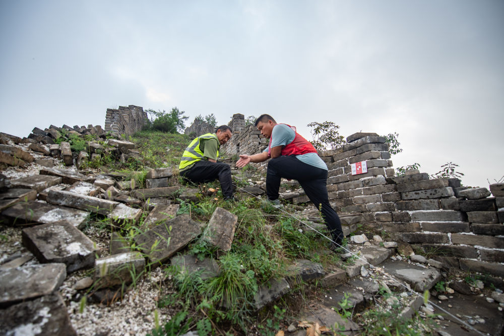 技工楊戰(zhàn)杰(右)在指導工人拉線劃設北京箭扣長城研究性修繕考古發(fā)掘范圍(2022年8月17日攝)。新華社記者 陳鐘昊 攝
