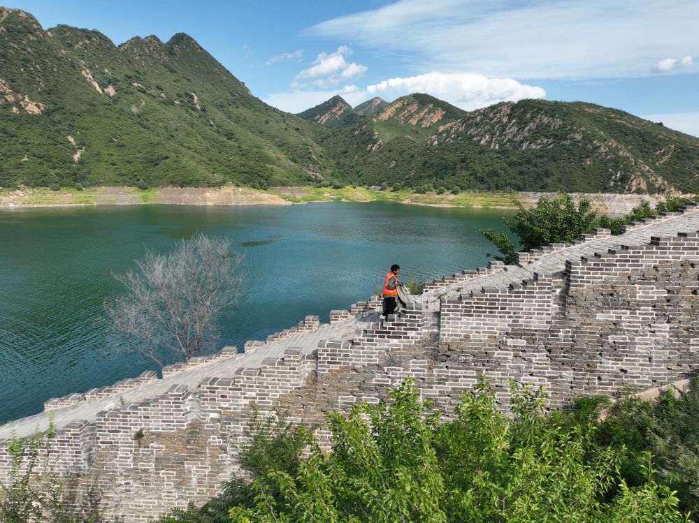 長城保護員衡丙三在長城上巡查。59歲的衡丙三是河北省唐山市遷西縣喜峰口二村的長城保護員,負責守護喜峰口西潘家口段古長城(2023年8月30日攝)。新華社記者 牟宇 攝