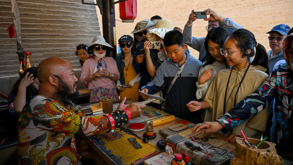 在甘肅嘉峪關關城景區(qū),網(wǎng)紅“關長”李森(左)為游客奉上自己手寫好的文創(chuàng)產(chǎn)品“關照”(2023年7月14日攝)。新華社記者 劉金海 攝