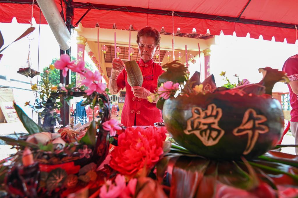 6月8日,一名女子在馬來西亞馬六甲市參加裹粽子比賽。當日,馬來西亞馬六甲市舉辦“2024年慶端午”系列活動,人們以裹粽子、游龍舟等方式迎接端午節(jié)。新華社 張紋綜 攝