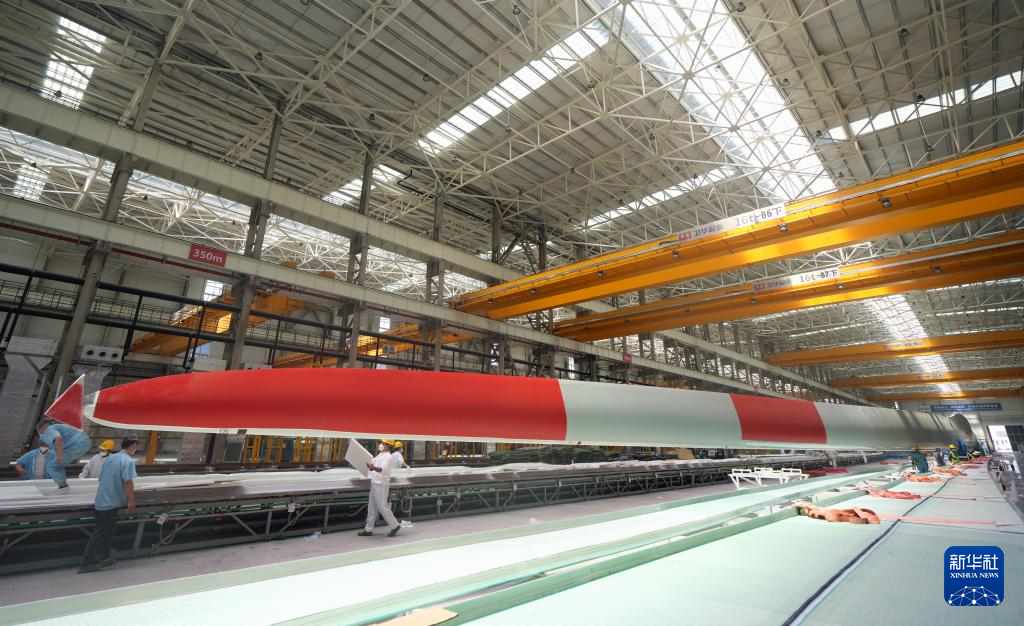 6月6日,在射陽中車風(fēng)電葉片工程有限公司生產(chǎn)車間拍攝的大型風(fēng)機(jī)葉片。新華社記者 李尕 攝