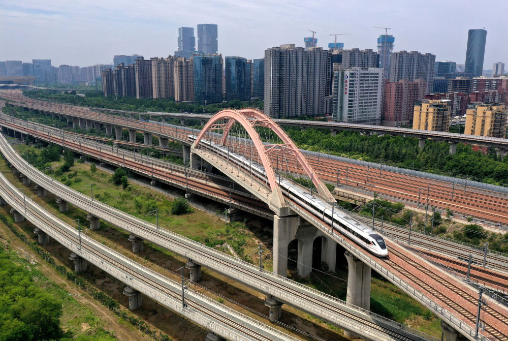 一列動(dòng)車(chē)組列車(chē)行駛在鄭州東站附近的線(xiàn)路上(5月30日攝)。新華社記者 李安 攝