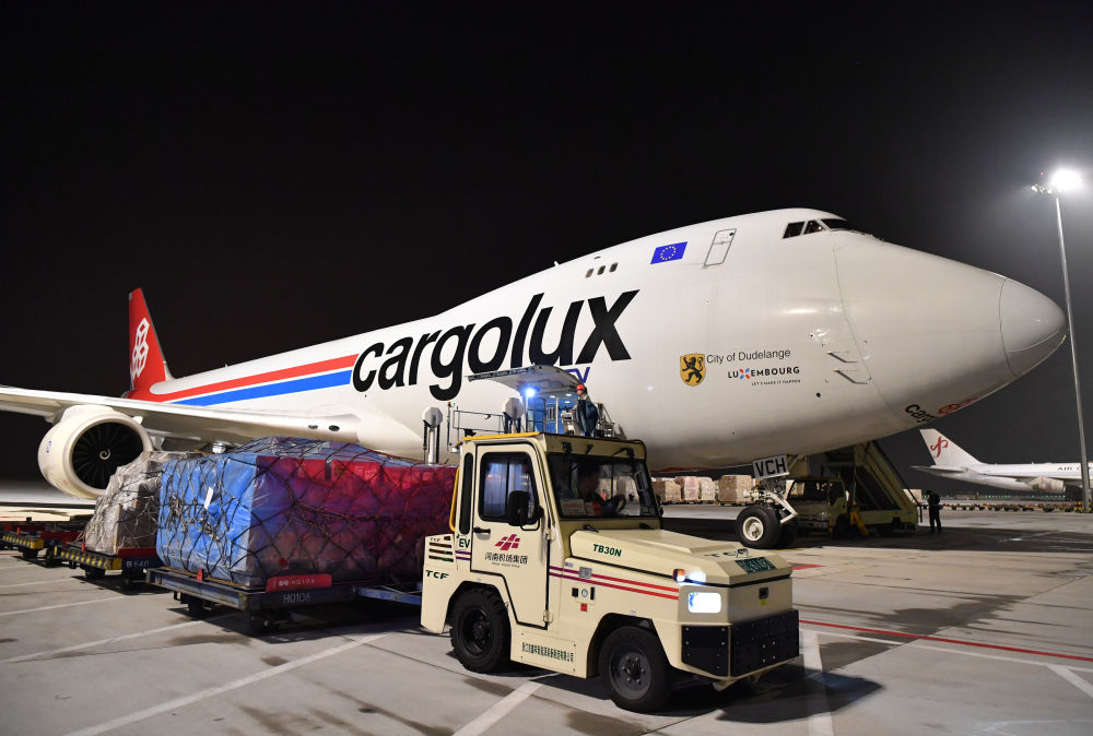 在鄭州新鄭國(guó)際機(jī)場(chǎng),工作人員駕駛新能源拖車(chē)為一架盧森堡貨航貨機(jī)卸貨(2023年8月1日攝)。新華社記者 李嘉南 攝