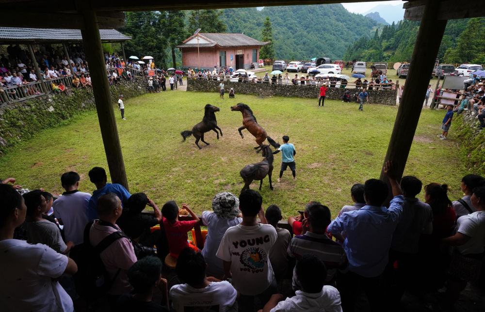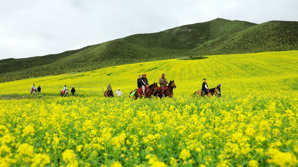 7月13日,游客騎馬游覽甘肅省張掖市民樂縣扁都口生態(tài)景區(qū)油菜花海。新華社發(fā)(成林攝)
