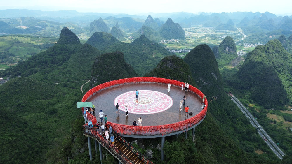 7月13日,游客在廣西桂林市陽朔縣如意峰觀景(無人機照片)。新華社發(fā)(廖祖平攝)